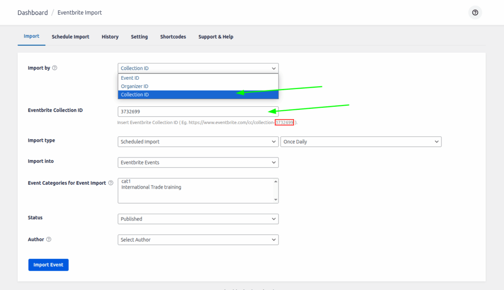 Import By : If you are importing from your own Eventbrite account, then you can use this option to import the event using the Collection ID number of the event. The ID number for an event is the string of numbers located in the Eventbrite.com URL for an event.