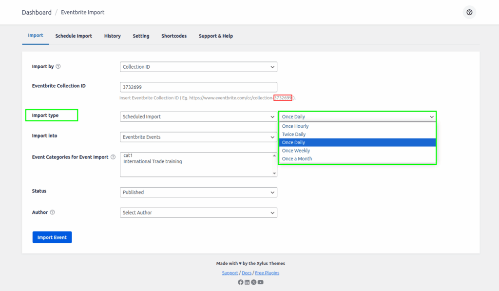Import Type : If you choose scheduled import it will give you option once Daily means event import once in day,once Hourly means one event import hourly,Twice daily means two event import daily, Once month means one event import monthly.