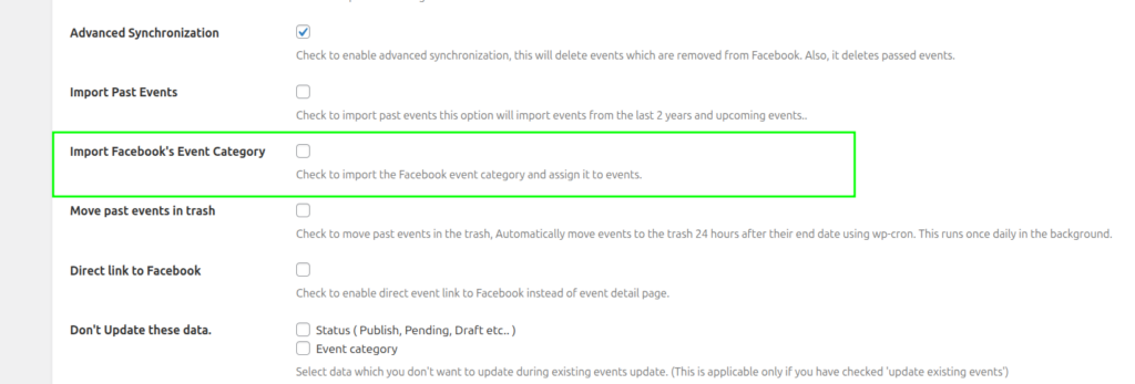 Import Facebook’s Event Category: Enable this option to import and update Facebook event categories and assign them to events.
