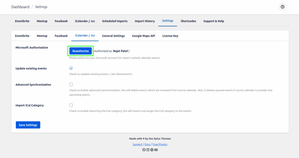 - After successful authorization, you will be automatically redirected back to the same iCalendar / .ics settings page.