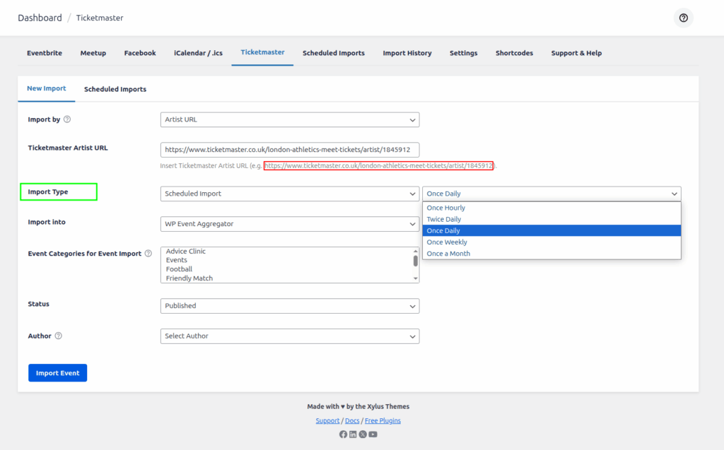 Import By : If you are importing from someone else’s Eventbrite account, then you can use this option to import the event using the Artist URL of the event. The URL for an Artist is the string located in the ticketmaster.co.uk URL for an event.