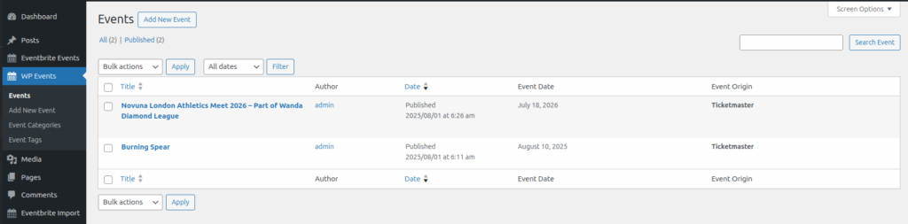 Once you have everything configured, click the Import button and your events will be added to WP Events.