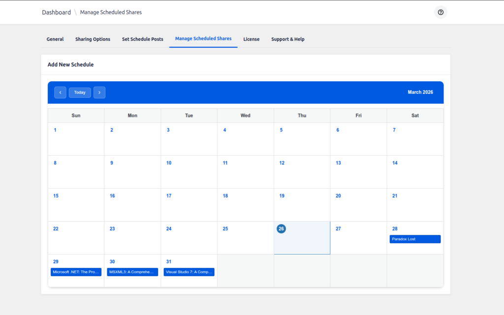 - The calendar view helps you manage all scheduled shares at a glance.